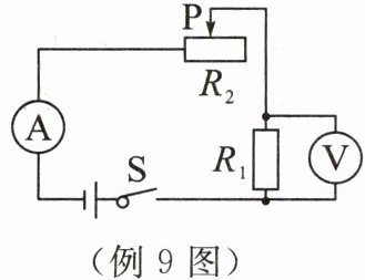 例 9 如图所示,电源电压为 $ 6 \, V $,定值电阻 $ R_{1} $ 的阻值为 $ 10 \, \Omega $,滑动变阻器 $ R_{2} $ 的阻值变化范围为 $ 0 \sim 20 \, \Omega $,闭合开关 $ S $,则当滑片 $ P $ 从最右端移到最左端时电流表和电压表的示数变化范围各是多少?