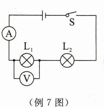 例 7 在如图所示的电路中,开关 $ S $ 闭合后两灯正常发光,一段时间后 $ L_{1} $ 熄灭、$ L_{2} $ 依然发光,则电流表的示数将