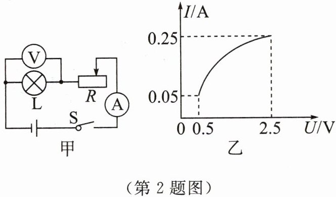 2. 在如图甲所示的电路中,电源电压为4.5 V,小灯泡的额定电压为2.5 V.闭合开关后,将滑动变阻器的滑片从最右端向左移动到某一位置的过程中,两电表的示数关系如图乙所示.下列判断正确的是 (