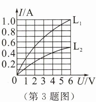 3. 有两盏灯: $ L_1 $ (标有“6 V 6 W”字样)和 $ L_2 $ (标有“6 V 3 W”字样).如图所示分别为通过两灯中的电流随电压变化关系的图像,则: