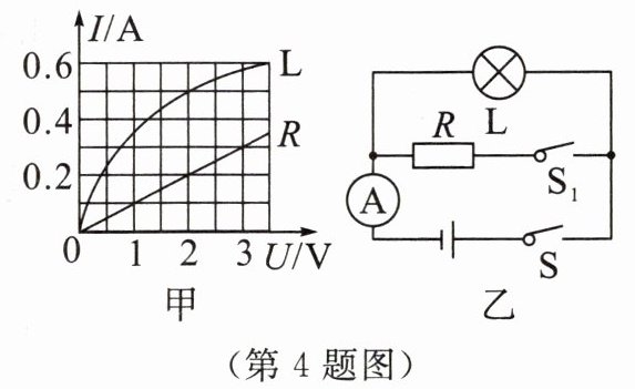 4. 如图甲所示是小灯泡L和电阻R的电流随电压变化的图像,将它们按图乙所示接入电路中,只闭合开关S,小灯泡的实际功率为1 W;再闭合开关 $ S_1 $,电流表的示数变化了