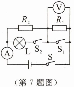 7. 如图所示,电源电压恒定, $ R_1 $、$ R_2 $ 为定值电阻, $ R_2 = 20 \Omega $,灯泡L上标有“6 V 3 W”字样.