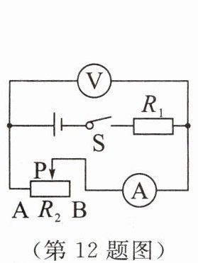12. 在如图所示的电路中,电源电压不变, $ R_1 $ 为定值电阻, $ R_2 $ 为滑动变阻器(A、B为其两端点).闭合开关S,当滑片P在某一端点时,电流表的示数为0.1 A, $ R_2 $ 消耗的电功率为1 W;当滑片P移动至某一位置时,电流表的示数为0.3 A, $ R_2 $ 消耗的电功率为1.8 W.在当滑片P从A移到B的过程中 (