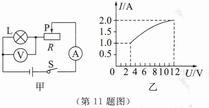 11. 如图甲所示,电源电压保持不变,小灯泡的额定电压为12 V,闭合开关S后,在滑片P从最右端滑到最左端的过程中,小灯泡的 $ I - U $ 关系图像如图乙所示.下列说法中错误的是 (