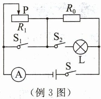 例 3 如图所示,电源电压恒定,$ R_0 $ 是定值电阻,小灯泡 L 上标有“6 V 3 W”字样,滑动变阻器 $ R_1 $ 的最大阻值为 20 Ω.三个开关均闭合时,小灯泡恰好正常发光,电流表示数为 1.5 A.