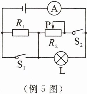 例 5 如图所示,电源电压恒为 6 V,小灯泡 L 上标有“6 V 3 W”字样(灯丝电阻不变),当 $ S_1 $、$ S_2 $ 都闭合,且滑动变阻器 $ R_2 $ 的滑片 P 在中点时,电流表的示数为 1.1 A,此时小灯泡的功率为 $ P_1 $;当 $ S_1 $、$ S_2 $ 都断开时,小灯泡实际消耗的功率为 $ P_2 $,且 $ P_2 : P_1 = 1 : 4 $.求: