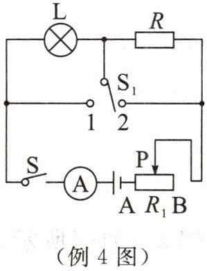 例 4 如图所示,灯泡 L 上标有“6 V 3 W”字样,定值电阻 $ R = 10 \Omega $,滑动变阻器 $ R_1 $ 的最大阻值为 20 Ω,闭合开关 S.将开关 $ S_1 $ 拨至 2,滑片 P 移至 A 端,灯泡正常发光.