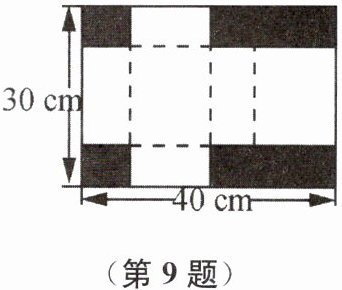 9. 如图,将一张长方形纸板的四个角上分别剪掉 $ 2 $ 个小正方形和 $ 2 $ 个小长方形(阴影部分即为剪掉的部分),剩余的部分可以折成一个有盖的长方体盒子(纸板的厚度忽略不计).若长方形纸板边长分别为 $ 40 \, cm $ 和 $ 30 \, cm $,且折成的长方体盒子表面积是 $ 888 \, cm^2 $,则剪掉的小正方形的边长为