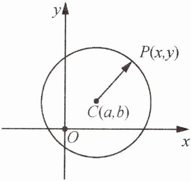 平面上两点 P₁(x₁,y₁),P₂(x₂,y₂)之间的距离表示为 |P₁P₂| = √((x₁ - x₂)² + (y₁ - y₂)²),称为平面内两点间的距离公式,根据该公式,如图,设 P(x,y)是圆心坐标为 C(a,b),半径为 r 的圆上任意一点,则点 P 适合的条件可表示为 √((x - a)² + (y - b)²) = r,变形可得:(x - a)² + (y - b)² = r²,我们称其为圆心为 C(a,b),半径为 r 的圆的标准方程。