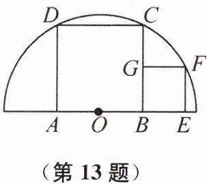 13. 正方形 $ ABCD $、正方形 $ BEFG $,点 $ A $、$ B $、$ E $ 在半圆 $ O $ 的直径上,点 $ D $、$ C $、$ F $ 在半圆 $ O $ 上,若 $ EF = 4 $,求该半圆的半径.