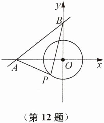 12. 如图,直线 $ y = \frac{3}{4}x + 3 $ 与坐标轴交于 $ A $、$ B $ 两点,$ \odot O $ 的半径为 2,点 $ P $ 是 $ \odot O $ 上动点,$ \triangle ABP $ 面积的最大值为