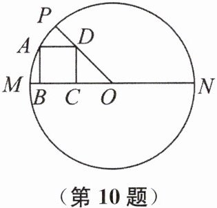 10. 如图,已知 $ \odot O $ 中,直径 $ MN = 10 $,正方形 $ ABCD $ 的四个顶点分别在半径 $ OM $、$ OP $ 以及 $ \odot O $ 上,并且 $ \angle POM = 45^{\circ} $,求 $ AB $ 的长.