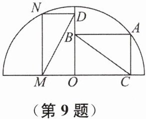 9. (2024 秋·浙江期中)如图,点 $ A $、$ N $ 在半圆 $ O $ 上,四边形 $ ABOC $,$ DNMO $ 均为矩形,$ BC = a $,$ MD = b $,则 $ a $、$ b $ 的关系为