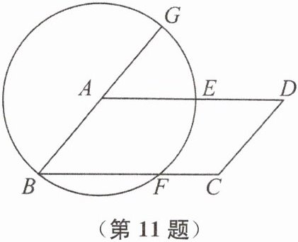 11. 如图所示,以 $□ ABCD$ 的顶点 $A$ 为圆心,$AB$ 为半径作圆,分别交 $AD$,$BC$ 于点 $E$,$F$,延长 $BA$ 交 $\odot A$ 于 $G$。