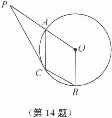 14. 如图,$A$、$B$ 是圆 $O$ 上的两点,$\angle AOB = 120^{\circ}$,$C$ 是劣弧 $\overset{\frown}{AB}$ 的中点。