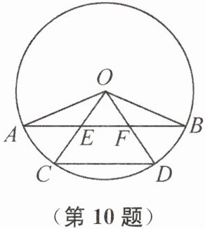 10. (2023 秋·沂源县期末)$AB$、$CD$ 是 $\odot O$ 的弦,$OC$、$OD$ 分别交 $AB$ 于点 $E$、$F$,且 $OE = OF$。求证:$\overset{\frown}{AC} = \overset{\frown}{BD}$。
