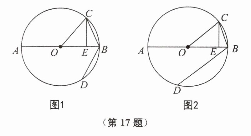 17. (2024·包头)如图,$AB$是$\odot O$的直径,$BC$,$BD$是$\odot O$的两条弦,点$C$与点$D$在$AB$的两侧,$E$是$OB$上一点($OE>BE$),连接$OC$,$CE$,且$\angle BOC=2\angle BCE$.