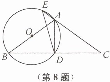 8. (2024·石阡县模拟)如图,△ABC 中,AB = AC,以 AB 为直径作⊙O,交 BC 边于点 D,交 CA 的延长线于点 E,连接 AD,DE.