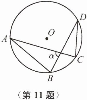 11. 如图,$\odot O$ 的半径为 $1$ cm,弦 $AB$,$CD$ 的长度分别为 $\sqrt{2}$ cm,$1$ cm,则弦 $AC$,$BD$ 所夹的锐角 $\alpha =$