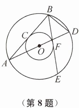 8. 如图, 两个同心圆的圆心是 O,AD 是大圆的直径, 大圆的弦 AB,BE 分别与小圆相切于点 C,F, 连接 BD, 则∠ABE + 2∠D 的度数为