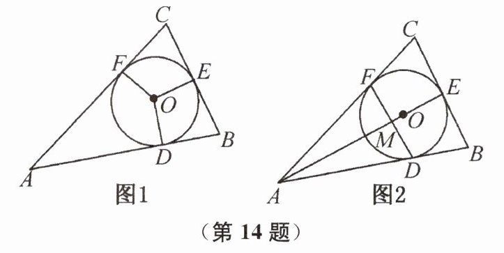 14. 已知△ABC 的内切圆⊙O 与 AB,BC,AC 分别相切于点 D,E,F, 若⌢{EF} = ⌢{DE}, 如图 1.