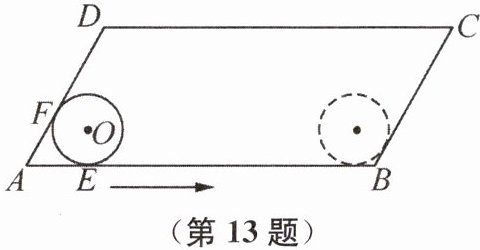 13. 如图, 在▱ABCD 中, ∠DAB = 60°,AB = 15 cm. 已知⊙O 的半径等于 3 cm,AB,AD 分别与⊙O 相切于点 E,F. ⊙O 在▱ABCD 内沿 AB 方向滚动, 与 BC 边相切时运动停止. 试求⊙O 滚过的路程.