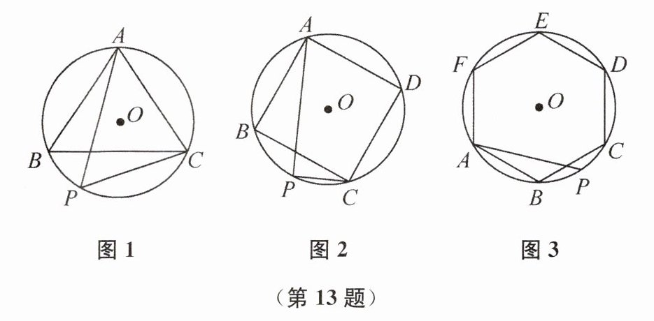 13. (1)已知,如图 1, $\triangle ABC$ 是⊙O 的内接正三角形,点 P 为弧 BC 上一动点,请探究 PA,PB,PC 三者之间有何数量关系,并给予证明.