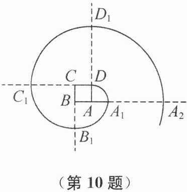 10. 如图,四边形 ABCD 是边长为$\frac{1}{2}$的正方形,曲线 DA₁B₁C₁D₁A₂…是由多段 90°的圆心角所对的弧组成的。其中,弧 DA₁ 的圆心为 A,半径为 AD;弧 A₁B₁ 的圆心为 B,半径为 BA₁;弧 B₁C₁ 的圆心为 C,半径为 CB₁;弧 C₁D₁ 的圆心为 D,半径为 DC₁…。弧 DA₁、弧 A₁B₁、弧 B₁C₁、弧 C₁D₁…的圆心依次按点 A、B、C、D 循环,则弧 C₂₀₂₂D₂₀₂₂ 的长是______(结果保留 π)。