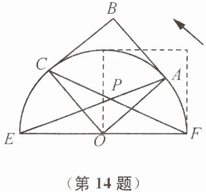 14. 如图,正方形 OABC 的边长为 2,以 O 为圆心,EF 为直径的半圆经过点 A,连接 AE,CF 相交于点 P,将正方形 OABC 从 OA 与 OF 重合的位置开始,绕着点 O 逆时针旋转 90°,交点 P 运动的路径长是