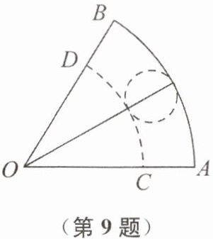 9. (2025·顺庆区二模)如图,在扇形纸片$OAB$中,$\angle O = 60^{\circ}$,$OA = 6cm$,把它沿虚线分割成一个扇形$OCD$和扇环,在扇环上裁出半径最大的圆,恰好能与扇形$OCD$与圆围成一个圆锥,则$OC$的长为