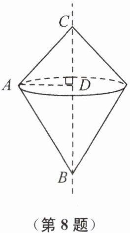 8. (2023·娄底)如图,在 $ \triangle ABC $ 中,$ AC = 3 $,$ AB = 4 $,$ BC $ 边上的高 $ AD = 2 $,将 $ \triangle ABC $ 绕着 $ BC $ 所在的直线旋转一周得到的几何体的表面积为