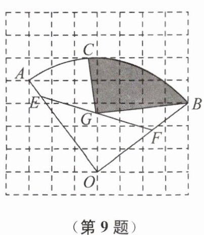 9. (2025·虞城县二模)在如图所示的网格中,每个小正方形的边长为 $ 1 $,点 $ A $、$ B $、$ O $ 均为格点,点 $ C $ 为弧 $ AB $ 的三等分点(靠近点 $ A $),点 $ E $、$ F $ 分别是线段 $ AO $、$ BO $ 上的动点,且 $ EF = 5 $,点 $ G $ 为 $ EF $ 的中点,连接 $ CG $、$ BG $.在 $ EF $ 滑动的过程中,当 $ CG $ 值最小时,阴影部分的面积是