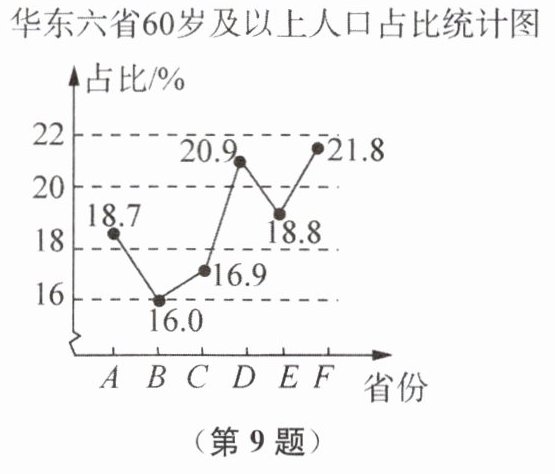 9. 根据第七次全国人口普查,华东A,B,C,D,E,F六省60岁及以上人口占比情况如图所示,这六省60岁及以上人口占比的中位数是