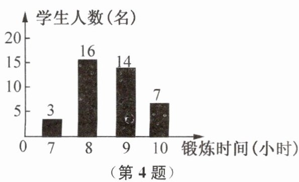 4. 如图是根据某班40名同学一周的体育锻炼情况绘制的条形统计图.那么该班40名同学一周参加体育锻炼时间的众数、中位数分别是 (