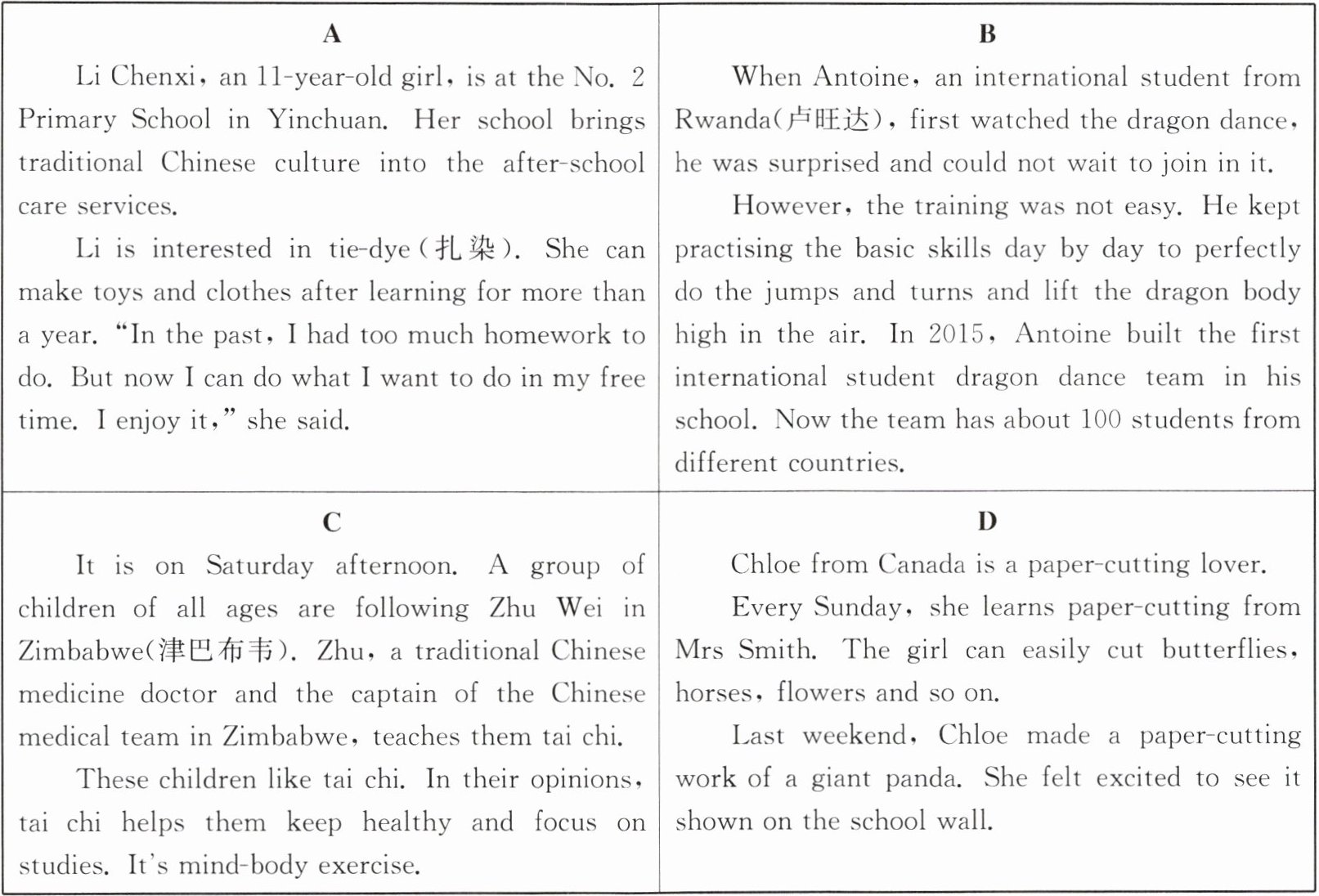 )3. Why do children in Zimbabwe choose to practise tai chi?① To make more friends. ② To learn about Chinese culture.