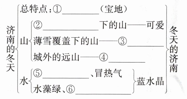 $\begin{matrix}& 济南的冬天 & & 冬天的济南 \\& \begin{cases}总特点:①$_________$(宝地) \\山 \begin{cases}②$_________$下的山——可爱 \\薄雪覆盖下的山——③$_________$ \\城外的远山——④$_________$\end{cases} \\