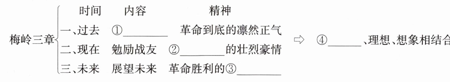 $梅岭三章\begin{cases}时间&内容&精神\\ 一、过去&①$_________$&革命到底的凛然正气\\ 二、现在&勉励战友&②$_________$的壮烈豪情\\ 三、未来&展望未来&革命胜利的③$_________$\end{cases} \Rightarrow④$_________$、理想、想象相结合$