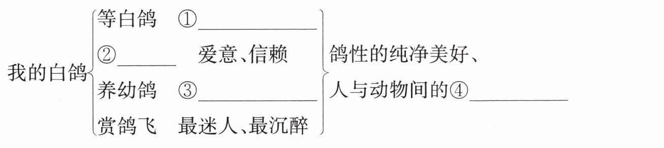 我的白鸽$\begin{cases} 等白鸽 & ①$______$ \\ ②$______$ & 爱意、信赖 \\ 养幼鸽 & ③$______$ \\ 赏鸽飞 & 最迷人、最沉醉 \end{cases} $鸽性的纯净美好、人与动物间的④______