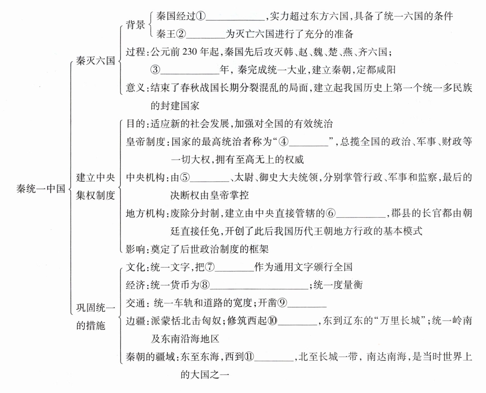 ①商鞅变法 ②嬴政 ③公元前221 ④皇帝 ⑤丞相 ⑥郡县制 ⑦小篆 ⑧圆形方孔半两钱 ⑨灵渠 ⑩临洮 ⑪陇西