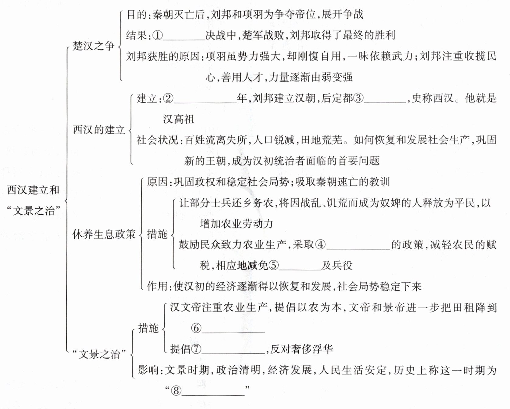 ①垓下 ②公元前 202 ③长安 ④轻徭薄赋 ⑤徭役 ⑥三十税一 ⑦勤俭治国 ⑧文景之治