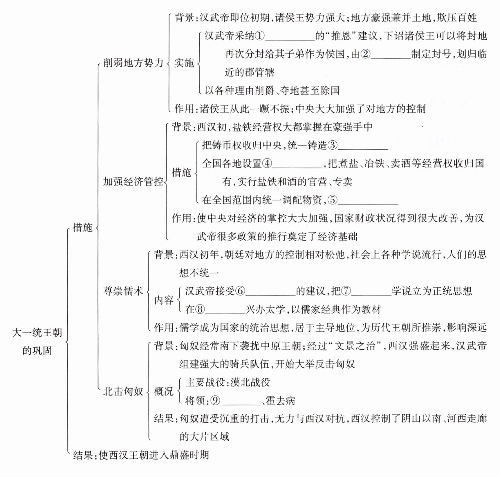 ①主父偃 ②皇帝 ③五铢钱 ④盐铁官 ⑤平抑物价 ⑥董仲舒 ⑦儒家 ⑧长安 ⑨卫青