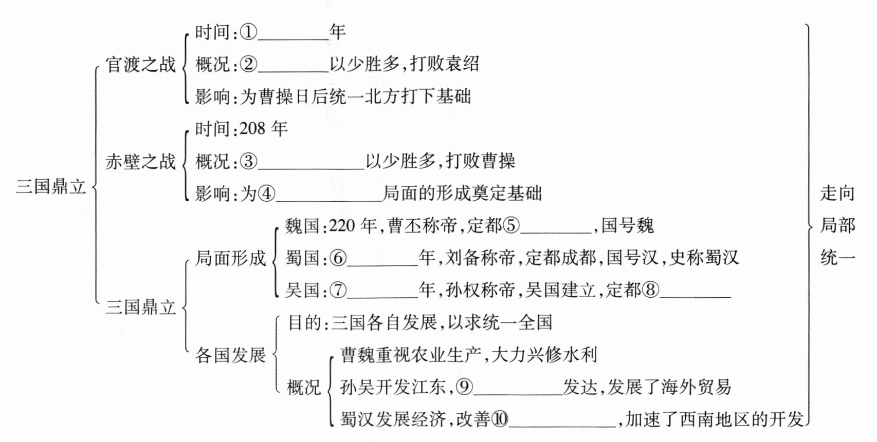 ①200 ②曹操 ③孙刘联军 ④三国鼎立 ⑤洛阳 ⑥221 ⑦229 ⑧建业 ⑨造船业 ⑩民族关系