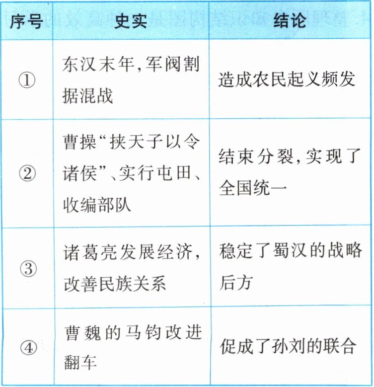 |②|曹操“挟天子以令诸侯”、实行屯田、收编部队|结束分裂,实现了全国统一|