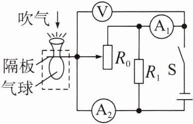 4. (2024·四川德阳中考)2024年3月,德阳市青少年科技创新代表队在第38届四川省青少年科技创新大赛中取得优异成绩。右图是本次大赛德阳市青少年科技创新小组自制的肺活量比较装置,通过观察电流表示数的变化即可比较肺活量的大小。滑动变阻器的阻值为$R_0$,定值电阻的阻值为$R_1$,电压表、电流表为理想电表,电源电压保持不变。现闭合开关S,科技创新小组成员向装置吹气,隔板向上平移,滑动变阻器接入电路的阻值变小,下列说法正确的是(