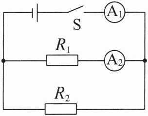 3. 将阻值$R_1$为10 $\Omega的电阻器与另一阻值为R_2$的电阻器接入电源电压恒定的电路,如图所示。闭合开关S,电流表$A_1$的示数为0.45 A,电流表$A_2$的示数为0.3 A,则通过阻值为$R_2$的电阻器的电流为