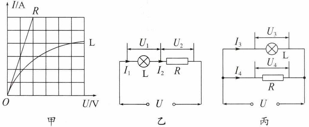 典型例题2 图甲表示灯泡 $ L $ 和定值电阻的 $ I - U $ 关系图像。将灯泡 $ L $ 和定值电阻先后以图乙和图丙两种方式接在同一恒压电源 $ U $ 上,流过它们的电流和它们两端电压如图所示,则下列判断正确的是(