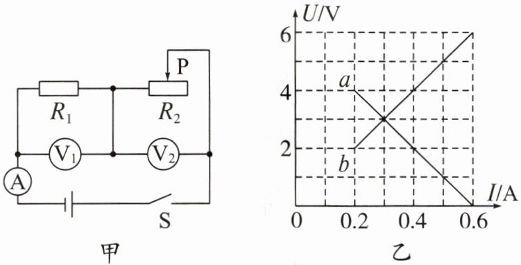 D [解析]从U-I关系图像可以看出,a为滑动变阻器的U-I关系图像,因为最后电压变为0,此时滑动变阻器的电阻为0;b为定值电阻的U-I关系图像。当滑动变阻器的阻值最大时,两者串联,电路中的电流最小,由题图乙可知,此时电路中的电流I = 0.2A,定值电阻两端的电压U₁ = 2V,滑动变阻器两端的电压U₂ = 4V,因为串联电路总电压等于各用电器两端的电压之和,所以电源电压U = U₁ + U₂ = 2V + 4V = 6V,A错误。根据欧姆定律可得,定值电阻的阻值R₁ = U₁ / I = 2V / 0.2A = 10Ω,B错误。滑动变阻器的最大阻值R₂ = U₂ / I = 4V / 0.2A = 20Ω,因为滑动变阻器的阻值可以从最大变化到最小,所以滑动变阻器的阻值变化范围为0~20Ω,C错误。滑动变阻器的滑片在中点时,接入电路的电阻R₂' = 10Ω,由串联电路的分压规律可知,此时定值电阻和滑动变阻器两端的电压均为1/2U = 3V,由题图乙可知,电流表的示数I' = 0.3A,D正确。