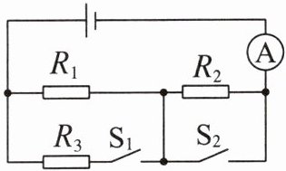 【典型例题 5】如图所示的电路中,电源电压保持不变,R_1 = R_2 = R_3 = 20 Ω,当 S_1、S_2 都断开时,电流表示数是 0.3 A。