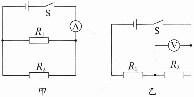 4. 两定值电阻并联在如图甲所示的电路中,电流表的示数为 0.4 A,通过阻值为$ R_2 $的定值电阻的电流为 0.3 A;再将阻值为$ R_1 $的定值电阻和阻值为$ R_2 $的定值电阻串联在如图乙所示的电路中,阻值为$ R_1 $的定值电阻两端的电压$ U_1 $和阻值为$ R_2 $的定值电阻两端的电压$ U_2 $之比为(