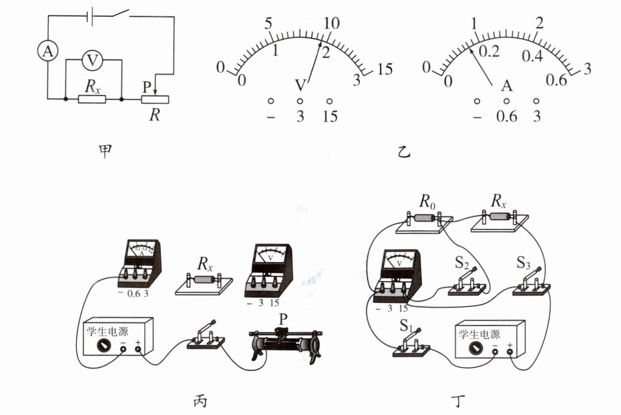 (2)图乙中电压表的示数为______ V,电流表的示数为______ A,本次测量的阻值 R_x 为______ Ω(精确到 0.1 Ω)。
